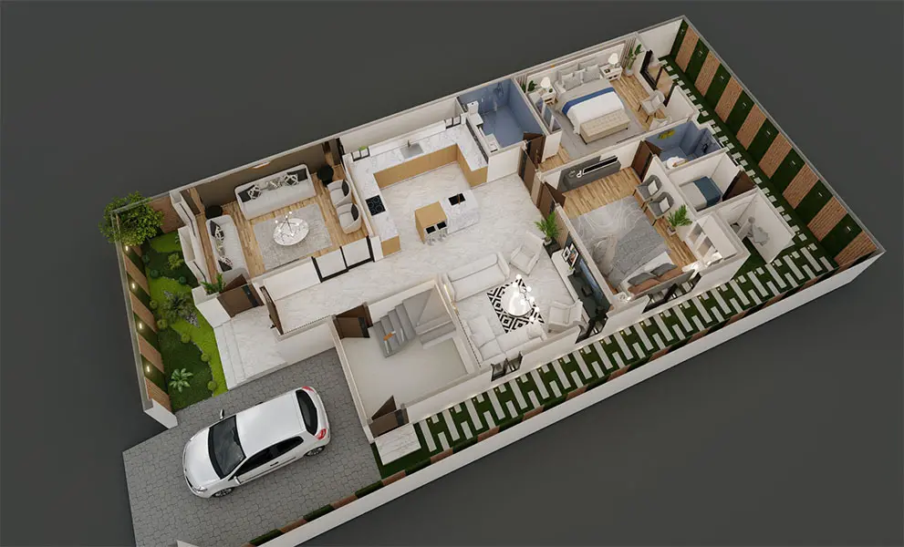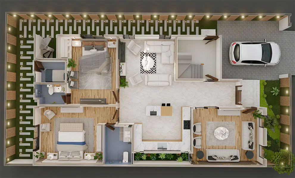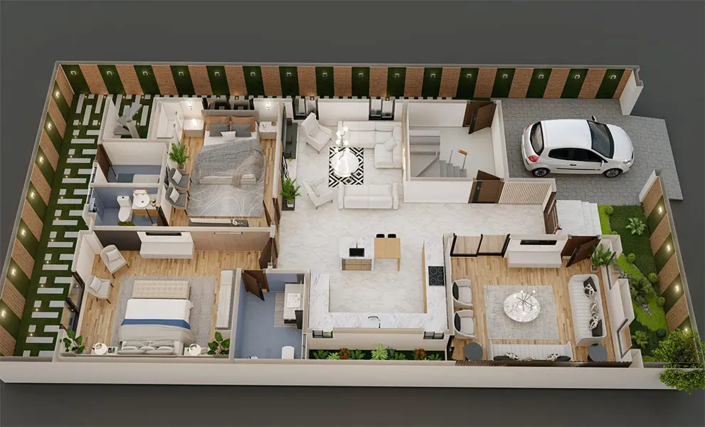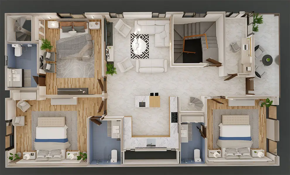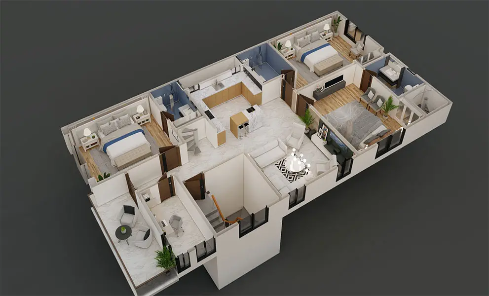 Work with knowledgeable architects and designers to create your dream 3D home design. We create 3D floor plan diagrams of distinctive displays of house designs that include the entire furniture, flooring, wall, and interior detail layouts in an aerial perspective of your property.